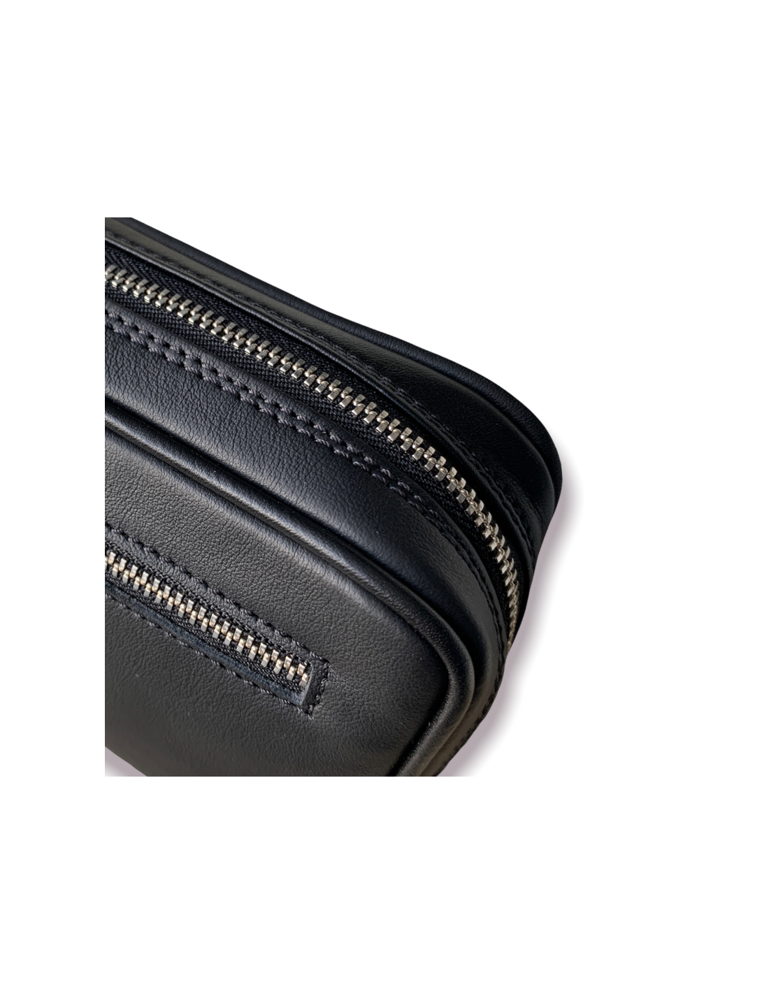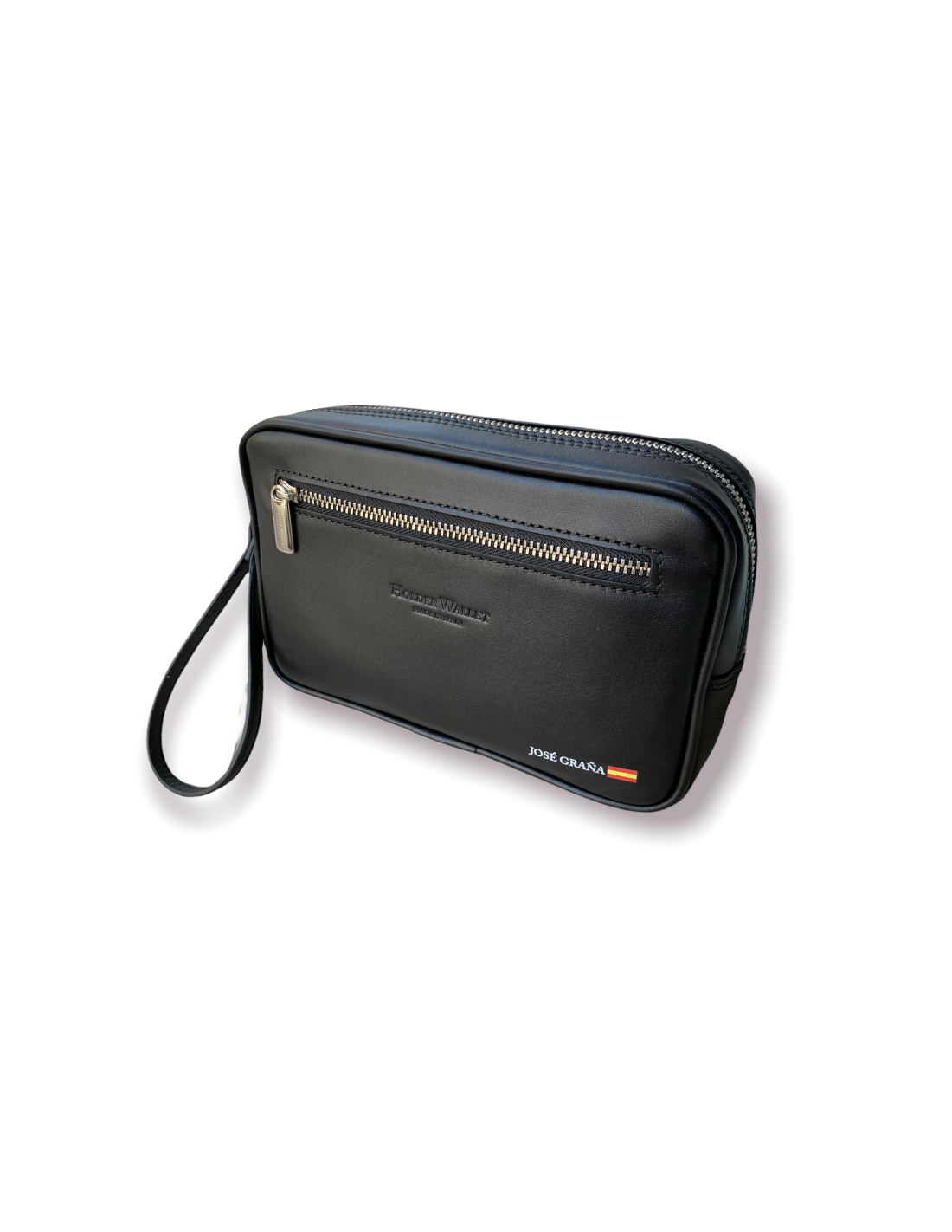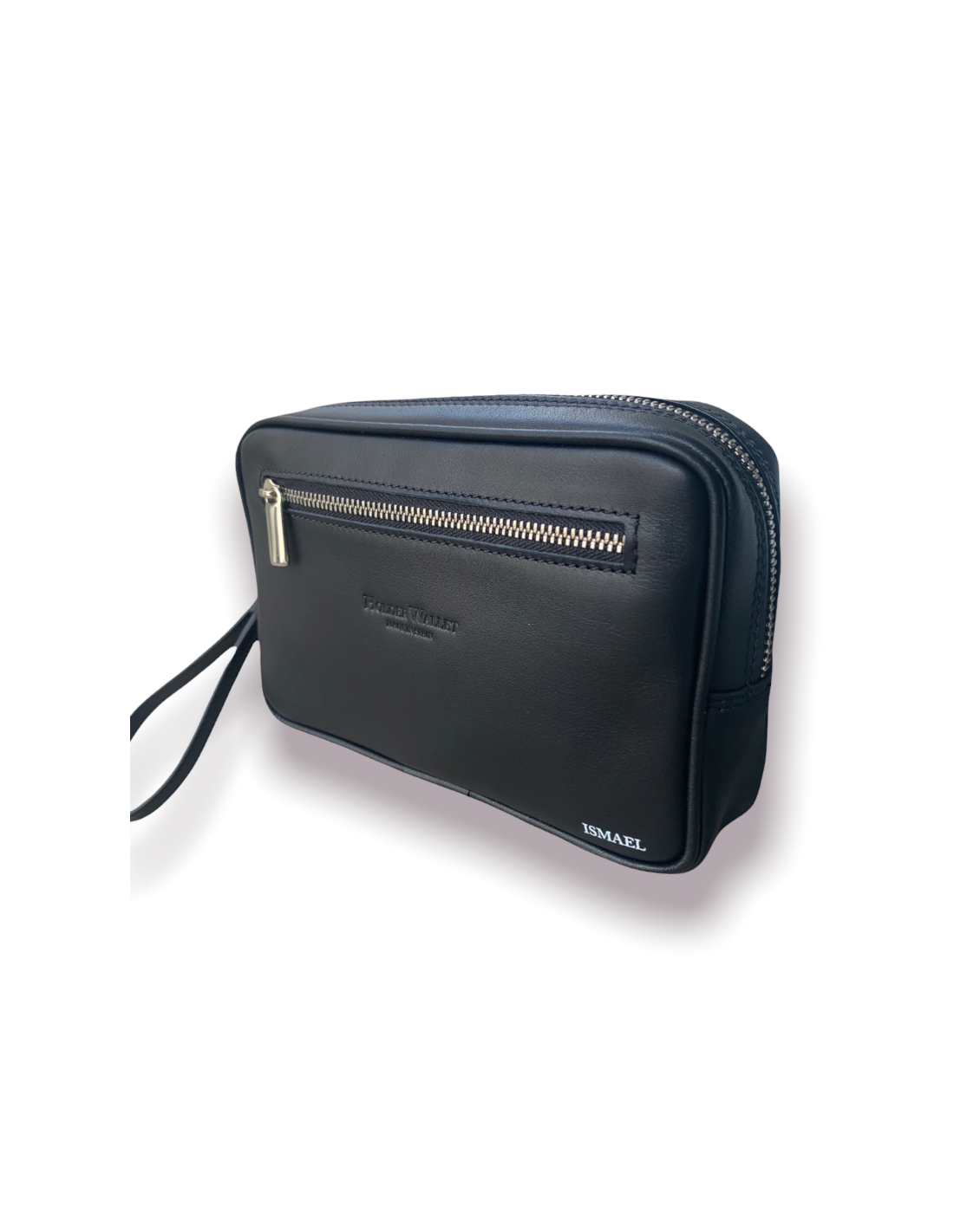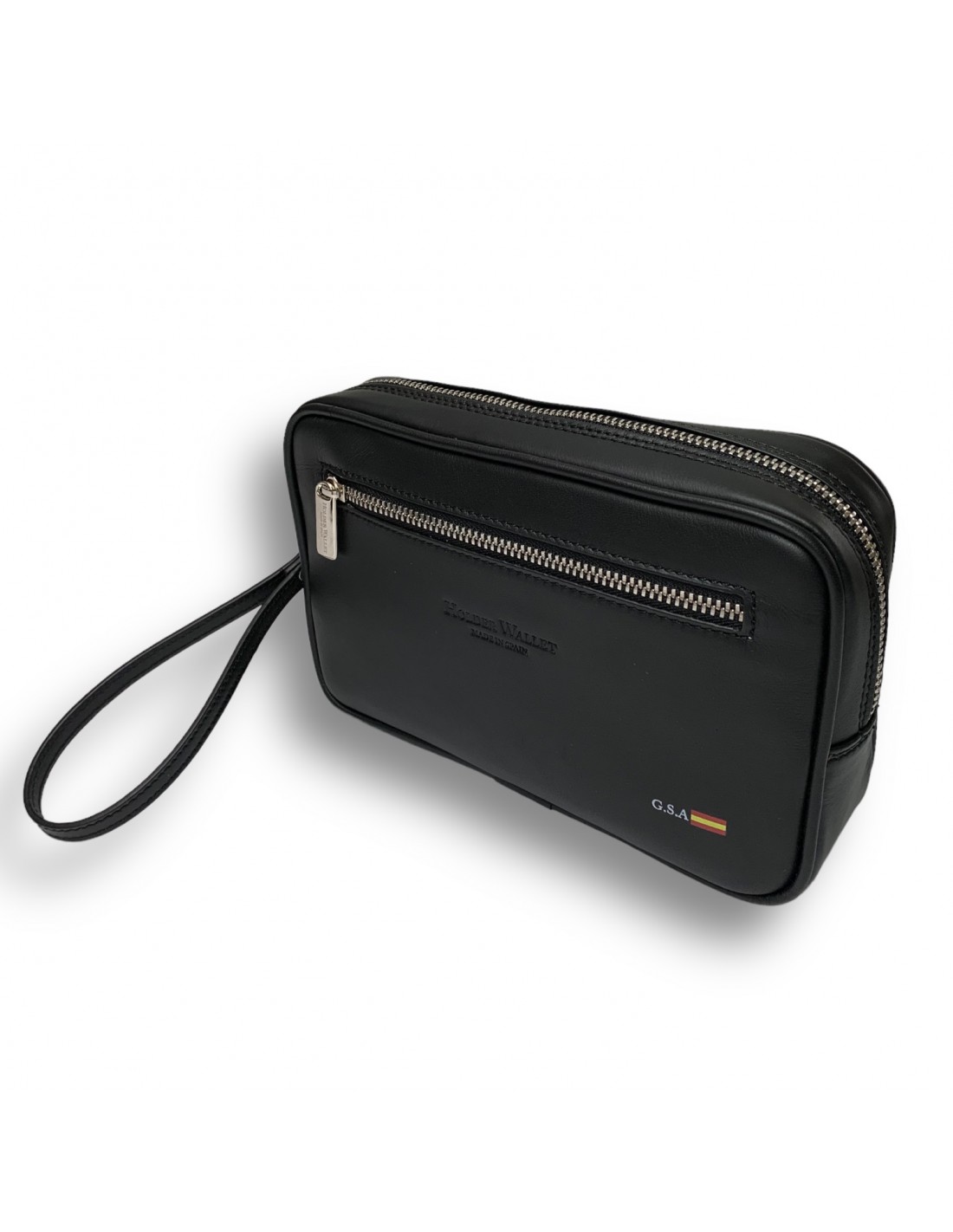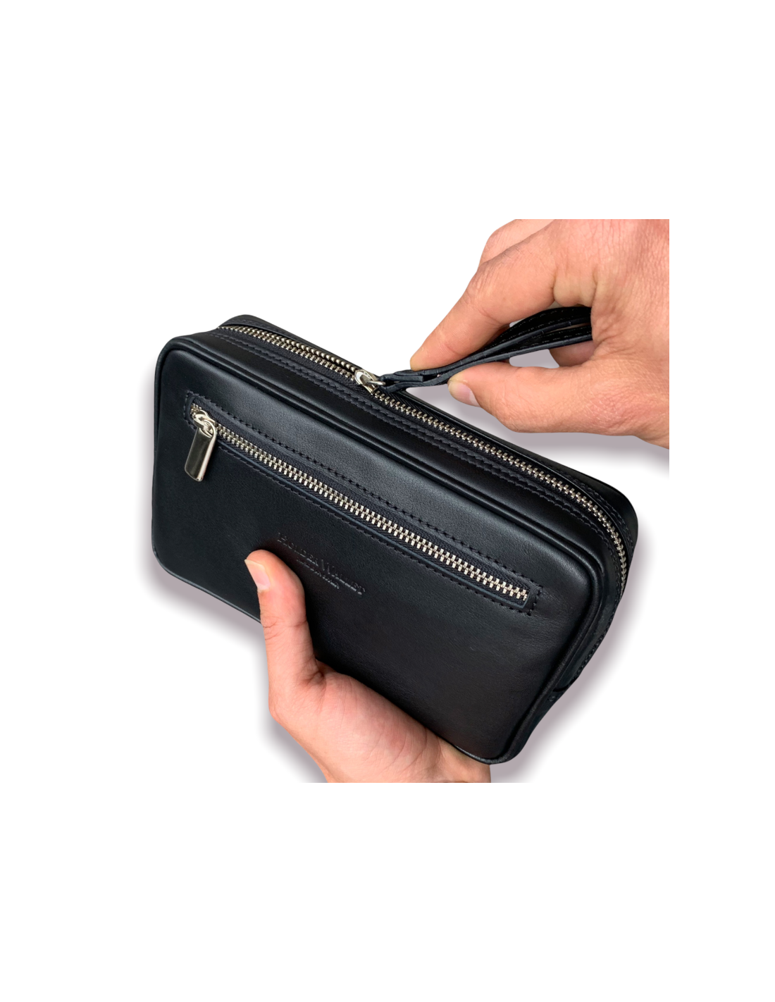 -100% leather toiletry bag with hand handle and double pocket, the one that accesses the inside of the bag and a zippered pocket on the outside front (we do not put inside zippered pocket to avoid damaging mobile)