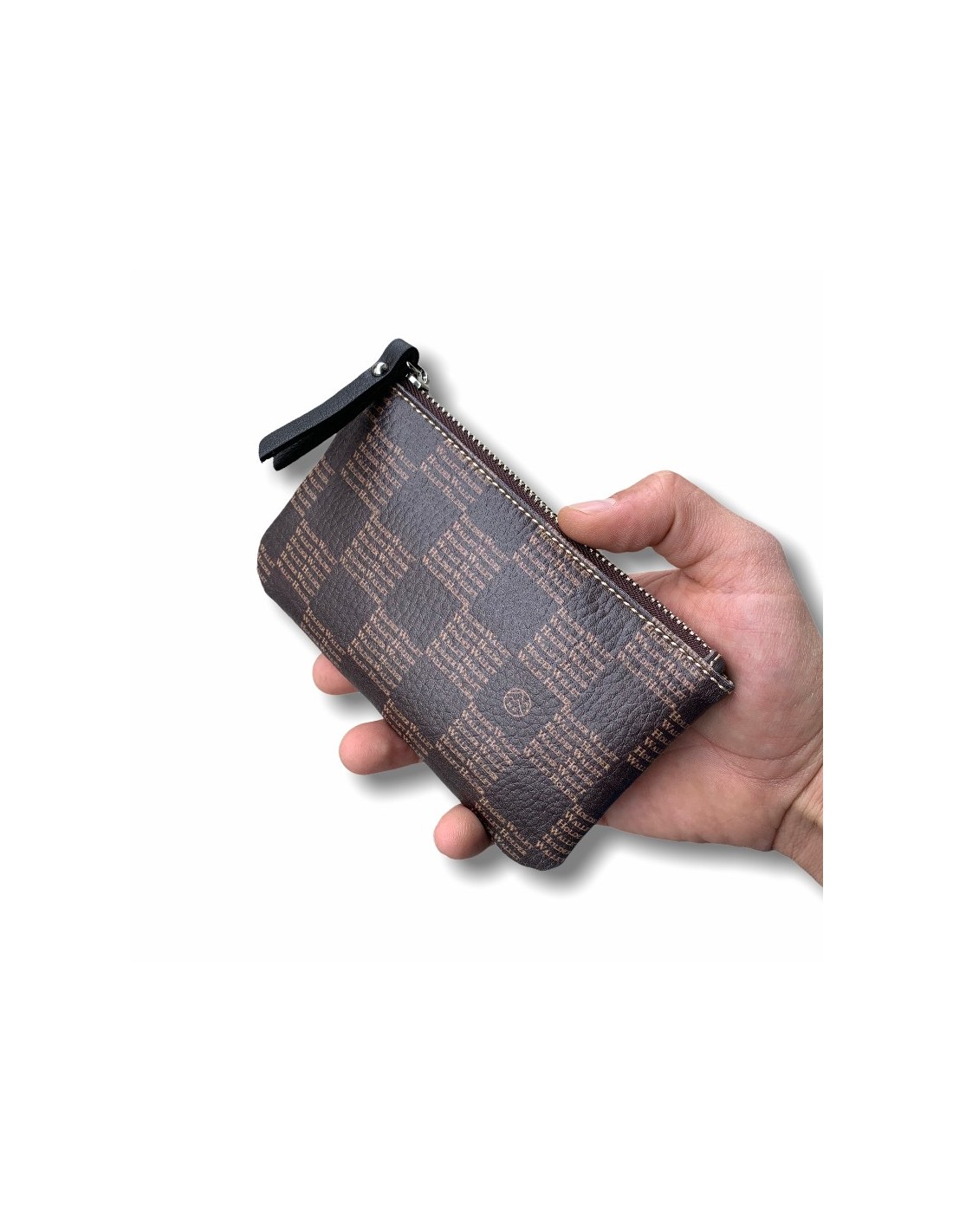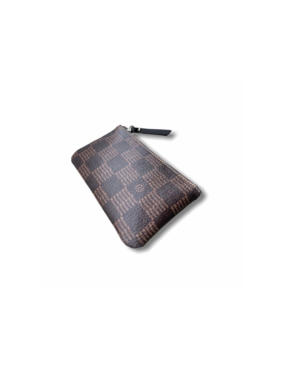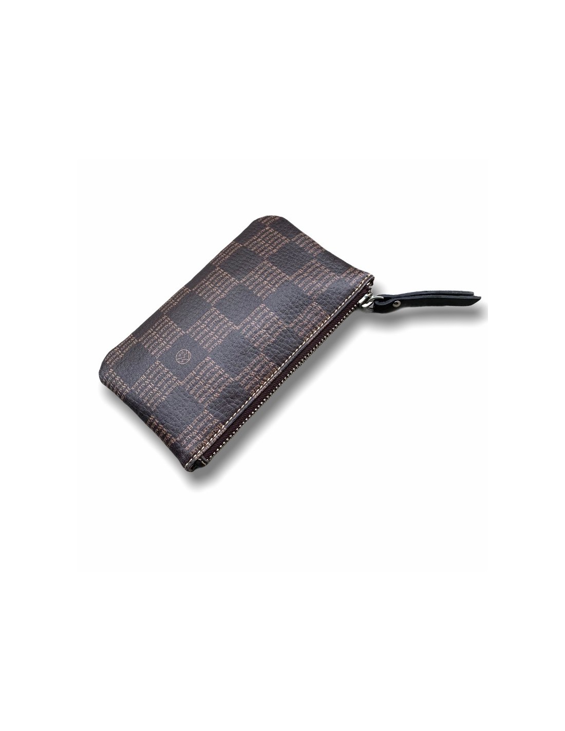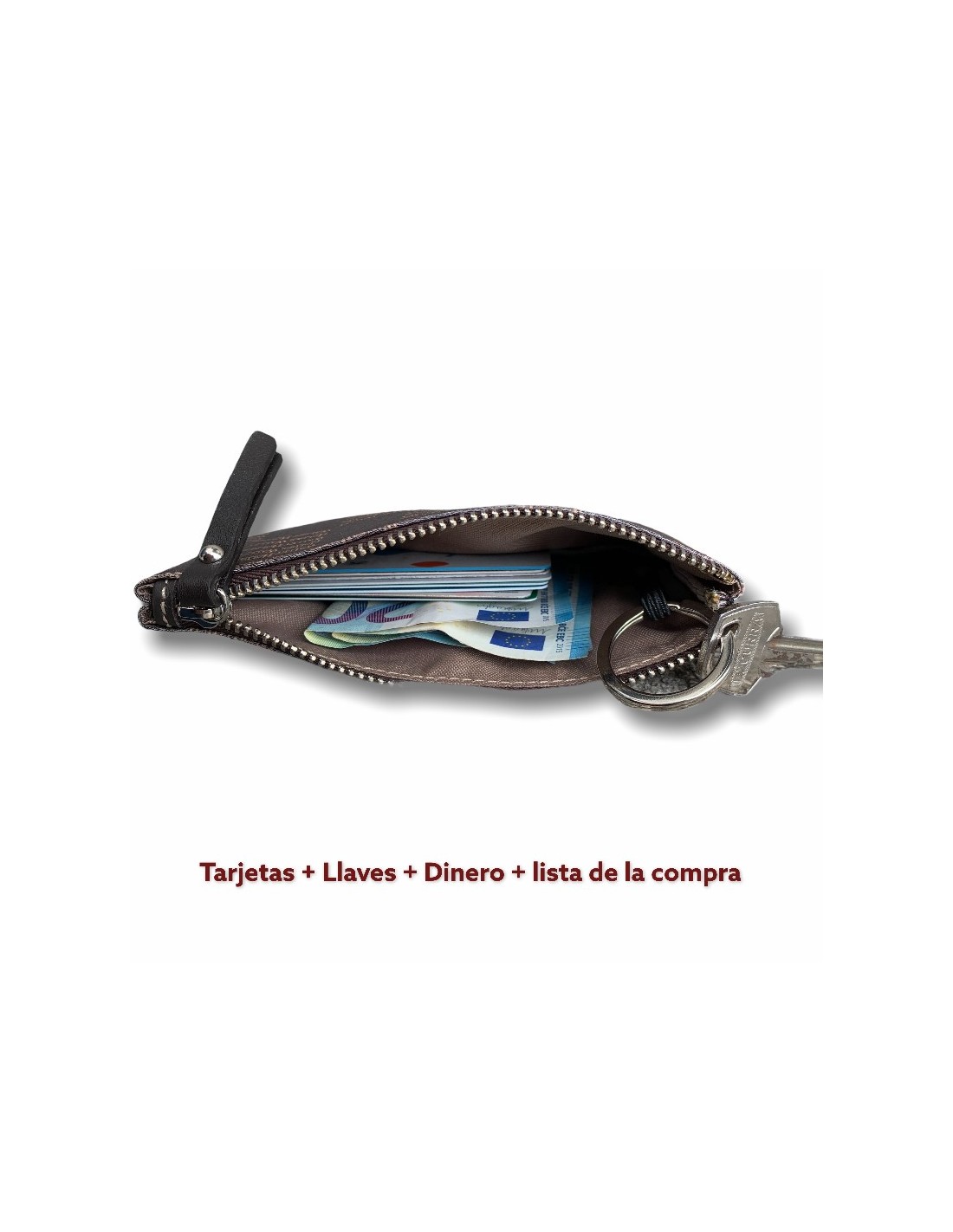 Flat purse made of eco-sustainable canvas and leather. In its interior we find a ring to hang our keys, capacity for cards, coins and banknotes.