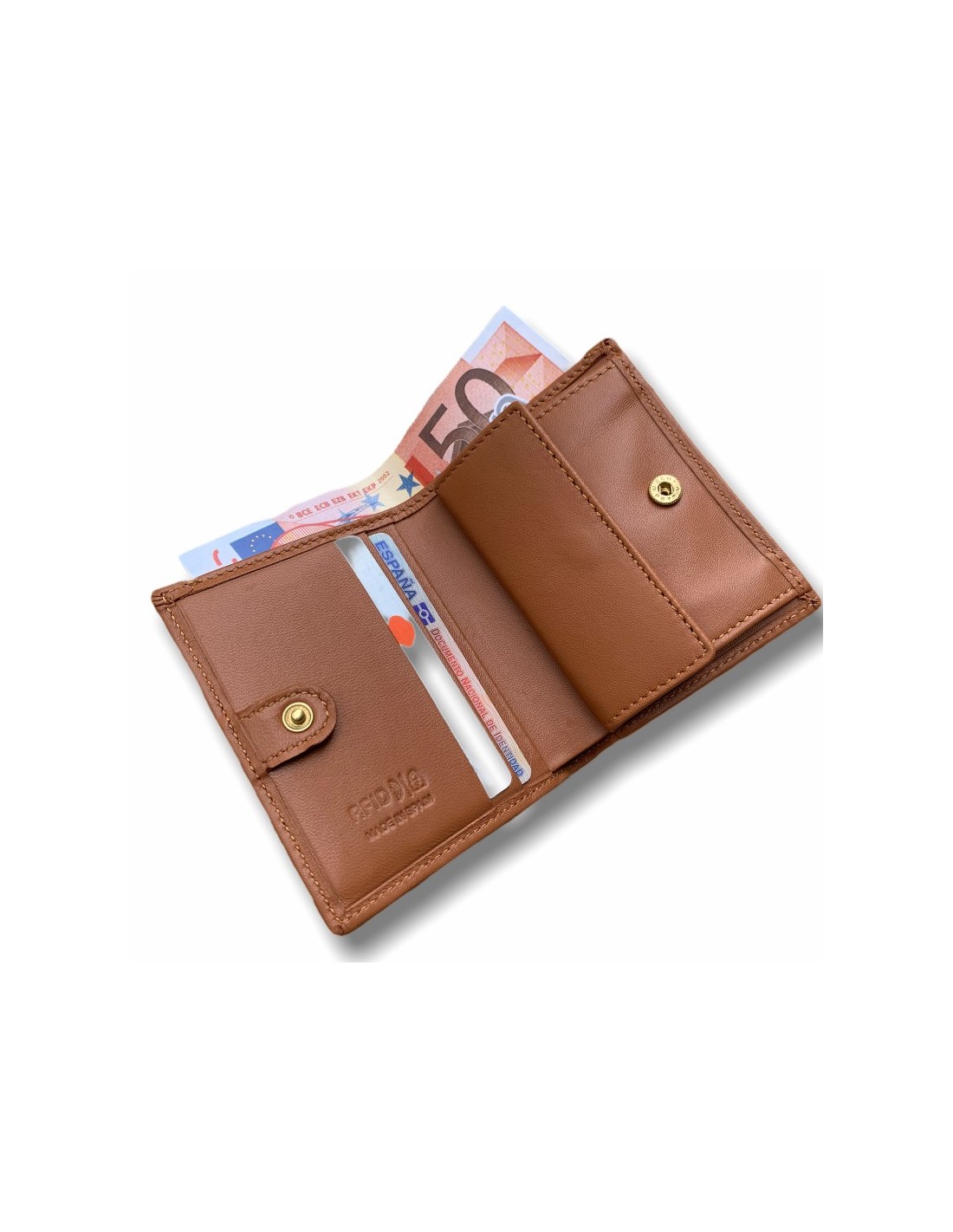 -It has three card slots, two in the card holder and one in the wallet where you can also insert cards or tickets, it also has a coin purse that closes with a button or clasp to prevent coins from escaping.