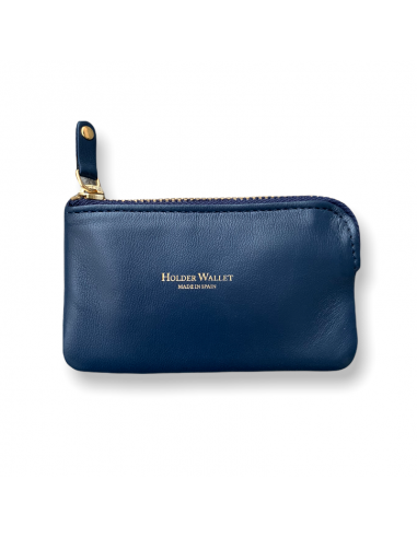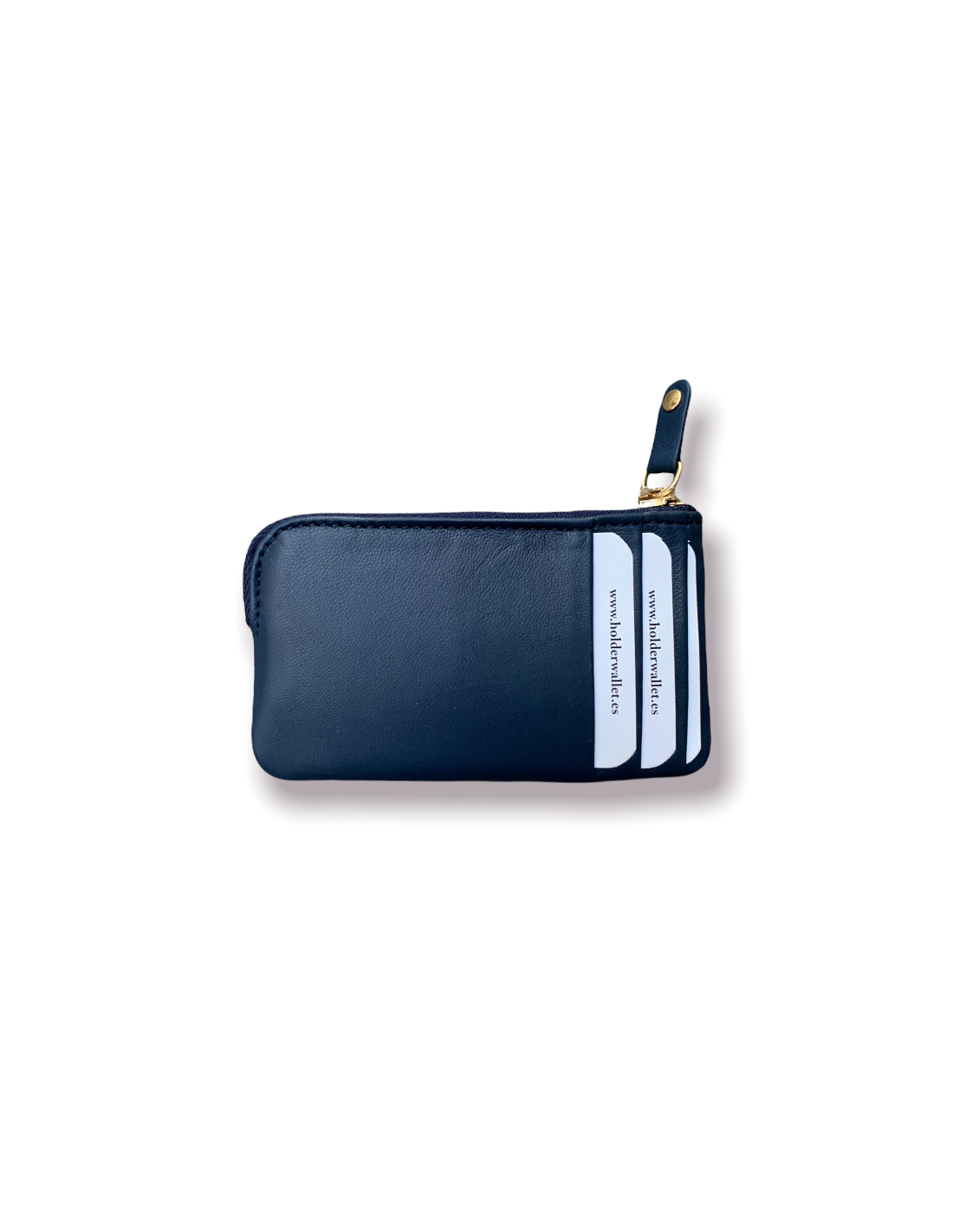 •Monedero tarjetero azul 100% piel con cremallera, consta con tres ranuras para tarjetas en su reverso y en cada ranura caben más de una tarjeta, en su apertura superior consta de una cremallera para monedas y billetes.
